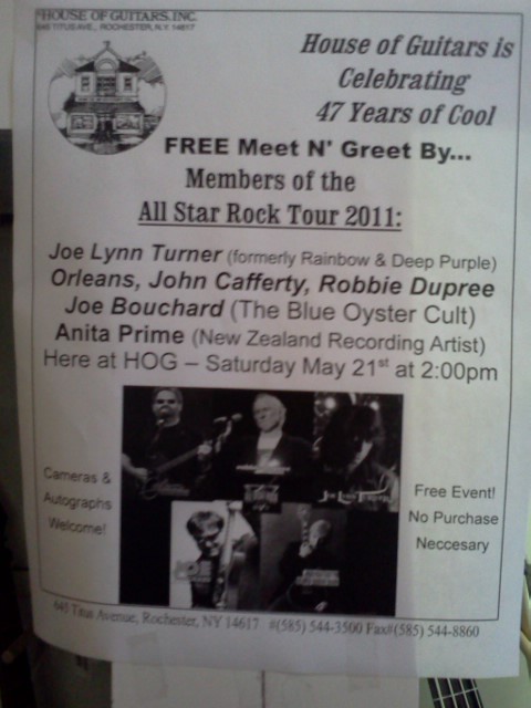 So, Rochester ! The day started with a signing at the House of Guitars which has been open for 47 years!! People tell me it’s definately on their “bucket list”, an amazing music store, apparently the largest in the world…lighting and a stage for signings, a CD/record store, a music school, a studio, and mega-tons of musical equipment for sale everywhere the eye can see. I got the guided tour and saw the wall of fame….honestly you can’t look at one corner that isn’t covered, it’s amazing! What an honor to sit with the All Star Rock Tour participants, music legends Orleans, Joe Lynn Turner (Rainbow, & Deep Purple), John Cafferty and Robbie Dupree, and sign some swag and posters for the Tour.